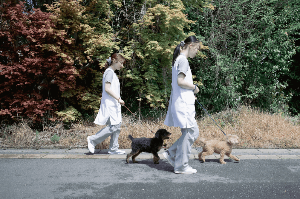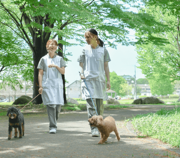 診察が始まると先生の補助にはいります。入院しているどうぶつ達のごはんやお世話をします。散歩も一緒にして、身体の状態も確認していきます。